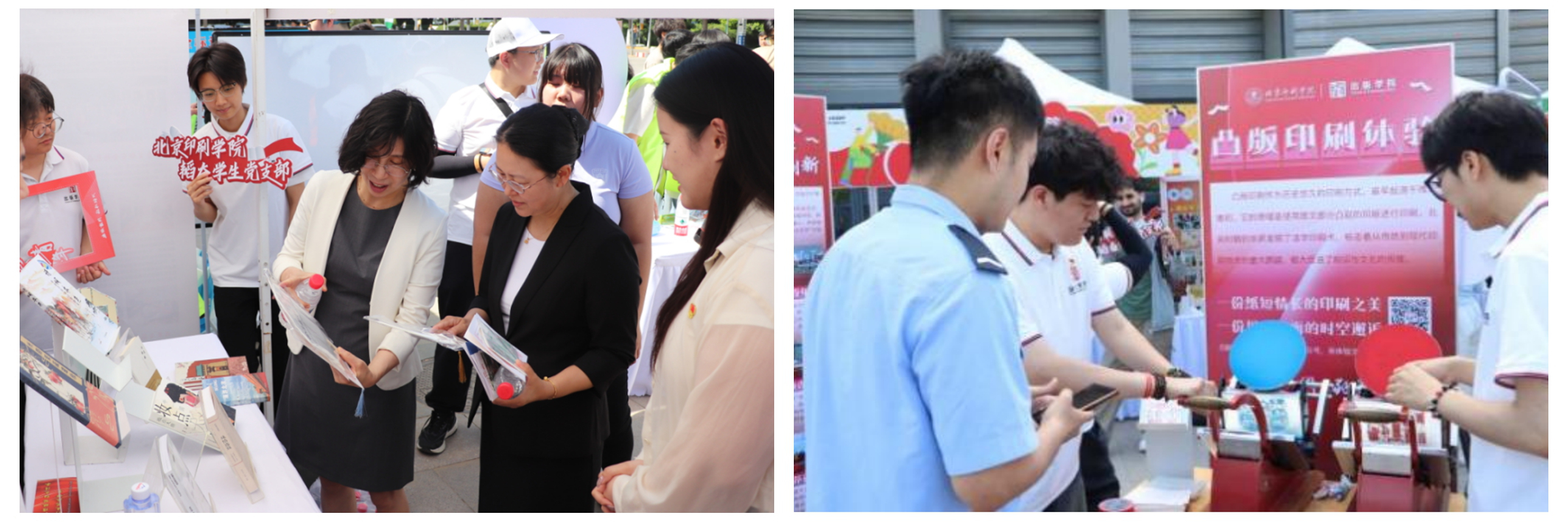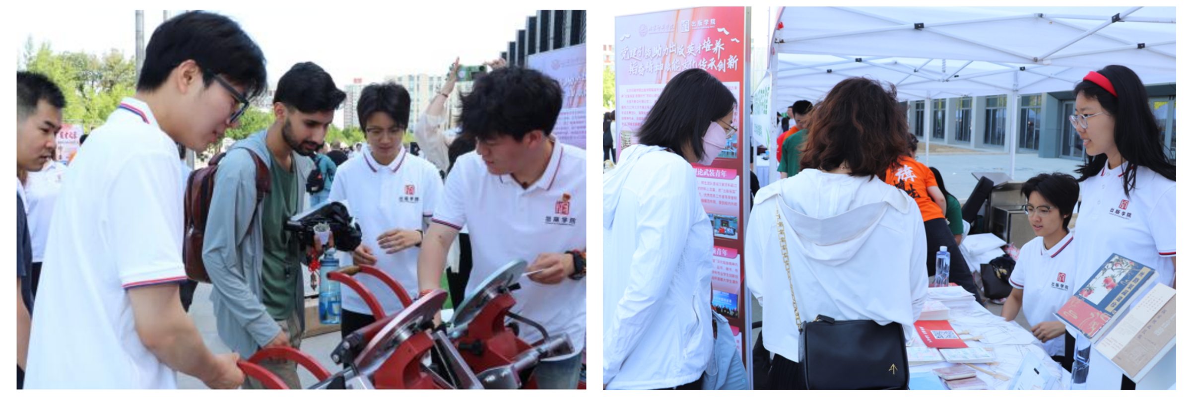 出版学院韬奋学生党支部在活动现场打造了一个别具特色的文化体验空间。活动现场展示了韬奋学子以中华优秀传统文化、京味文化、乡土文化等主题精心设计的模拟实体书,呈现专业知识与文化传承的深度融合。支部带来了出版文创印章、科普出版专业常识的文创漆扇等特色文创,通过承载学科底蕴的文创衍生品,将出版文化创新化、趣味化表达。活动还设置了套色印刷体验区,参与者可亲手操作传统印刷设备,体验从制版到印刷的全流程,感受现代印刷技术与传统工艺的融合创新。支部成员化身“出版文化宣传员”,通过图文展板、互动打卡等形式,讲述韬奋学生党支部建设发展历程,诠释“出版报国”的精神内涵。