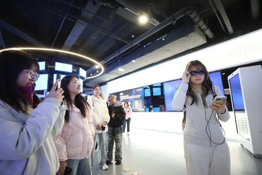 师生们首先参观园区数智创新中心,通过工作人员详细讲解,深入了解这片区域从传统商贸区向国际文化科技融合高地转型的发展历程。通过影像视频和数据展示,园区“文化+科技”双轮驱动的特色定位清晰呈现——这里不仅是城市记忆的承载地,更是前沿科技与文化创新深度融合的试验场。