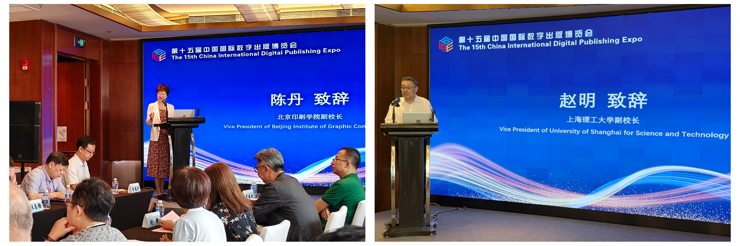 学校副院长陈丹在致辞中指出,北京印刷学院作为一所与出版印刷血脉相连的高校,始终以服务国家文化战略,助力出版行业发展为己任,积极回应时代命题。期待以此次论坛为平台,激发思想、分享智慧、凝聚共识,共同探索智能出版时代产教融合的新模式、新路径、新方案,为繁荣中国数字出版产业做出北印贡献。上海理工大学副校长赵明在致辞中,从学科交叉、实践互动、智能技术、协作共享四个方面出发,介绍了该校在智能出版时代产教融合方面的探索。