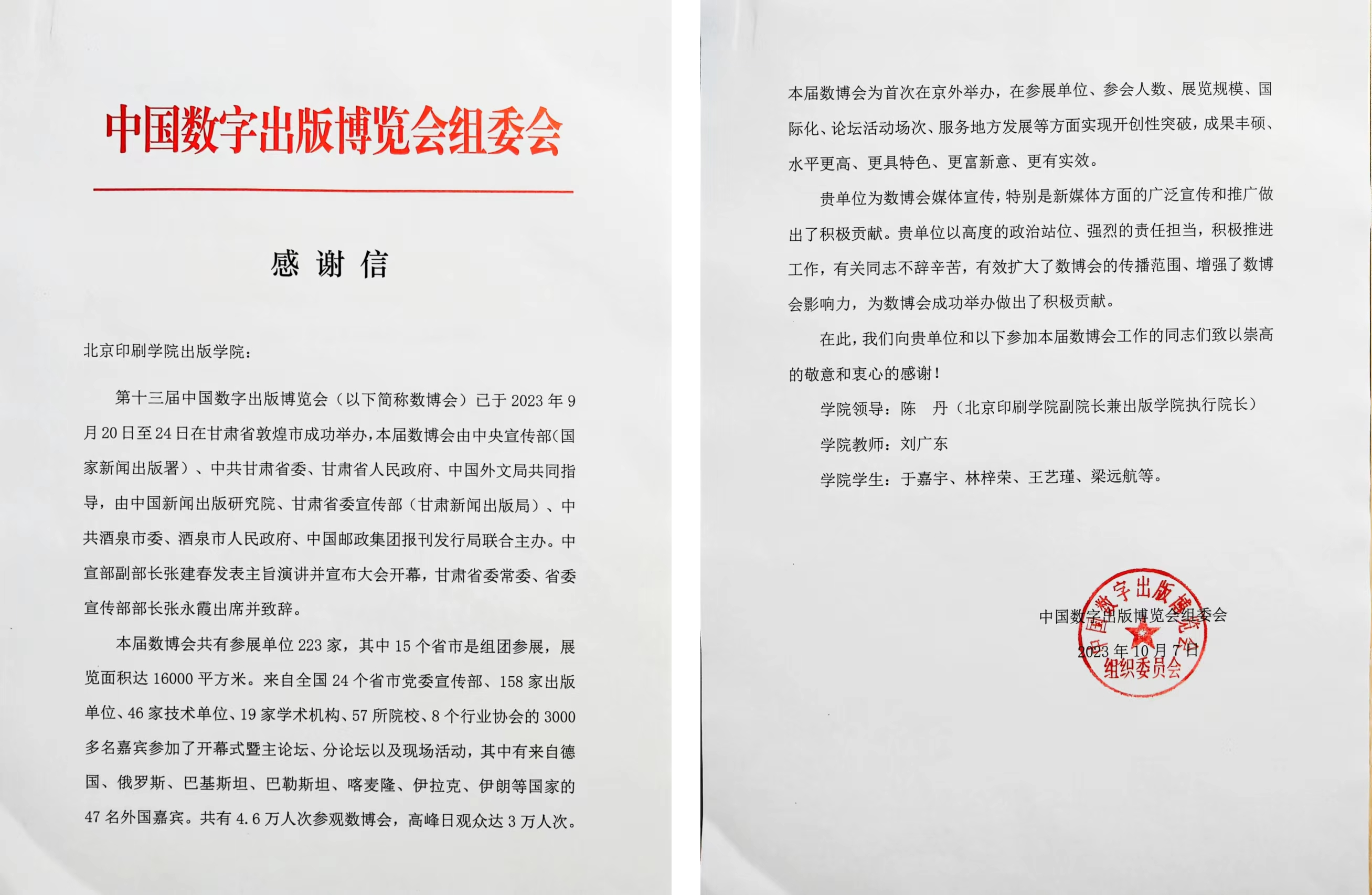 近日,中国数字出版博览会组委会给我院发来感谢信,对我院师生在数博会筹备和举办期间的工作给予高度肯定。