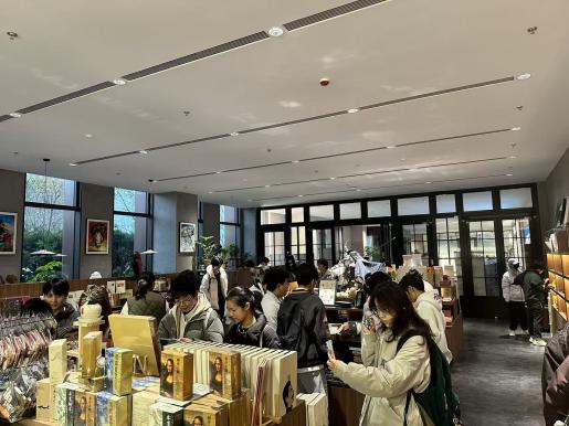 在人民文学出版社,同学们首先参观了社史展,感受人民文学出版社辉煌的发展历程。同学们还参观了人民文学出版社旗下文创品牌“朝花夕拾·阅读文创咖啡供销社”。店内精心设置的鲁迅文创区、哈利波特区、四大名著区等特色区域,瞬间吸引了同学们的目光。从印有经典文学语录的文具,到融入名著元素的创意摆件,各类文创产品让同学们深切感受到文学与创意的巧妙融合,对文创产品如何实现文学IP的活化利用有了更直观、深刻的认识,交流咨询的氛围十分热烈。